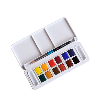 Set de viaje mini compuesto por 12 medios godets de acuarela Aquafine de Daler Rowney y un mini pincel nº 4. Aquafine es la gama académica de acuarelas de la marca Daler Rowney.