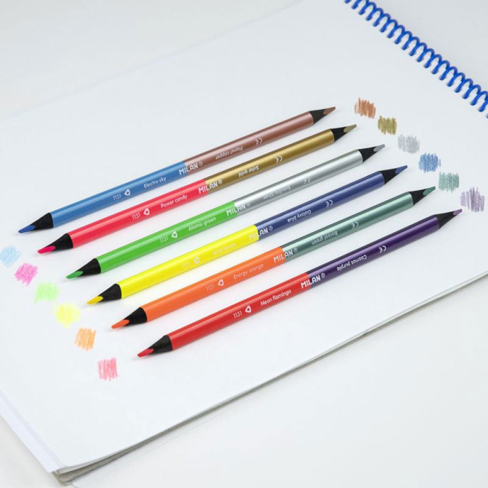 Lápices bicolores con mina de 2,9 mm Ø. 6 lápices, 12 colores (colores fluo + colores metalizados). Forma triangular ergonómica. La mina ofrece un trazo uniforme y es resistente a la rotura, gracias al sistema LPS (Lead Protection System) que protege la mina gracias a su adhesión con la madera. Madera procedente de plantaciones sostenibles. Cada color cuenta con un nombre propio.